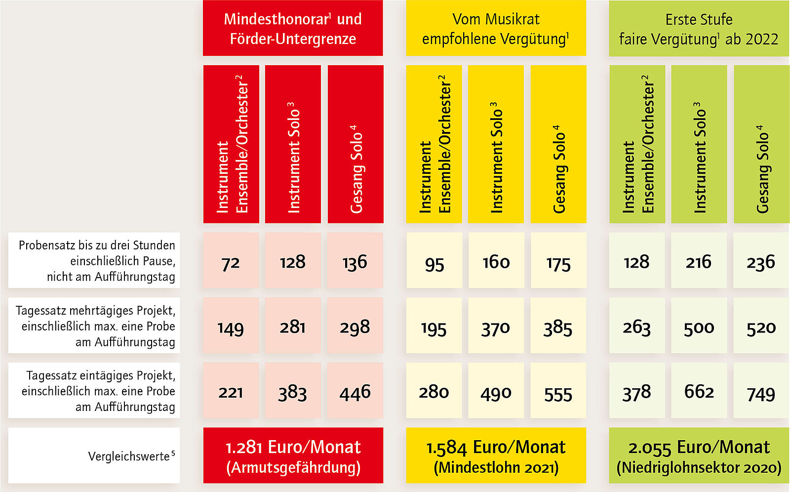 Für die Mehrzahl der Veranstalter, Institutionen und Auftraggeber ist eine vollständige Umsetzung der Empfehlungen wirtschaftlich, politisch oder fördertechnisch nicht sofort realisierbar. Andererseits dürfen und können sich die Empfehlungen für angemessene Honorare und die Ermittlungen von Mindest-Entgelten als unterste Grenze einer fairen Bezahlung von Akteuren in der Musik nicht nur an den aktuell üblichen, in der Regel für eine nachhaltige Existenzsicherung der Künstler viel zu niedrigen Sätzen und geplanten Budgets orientieren, sondern müssen von realen Erfordernissen, der wirtschaftlichen Notwendigkeit zum Erhalt der Angebote und zur Sicherung der Existenz der Anbieter künstlerischer Leistungen ausgehen.